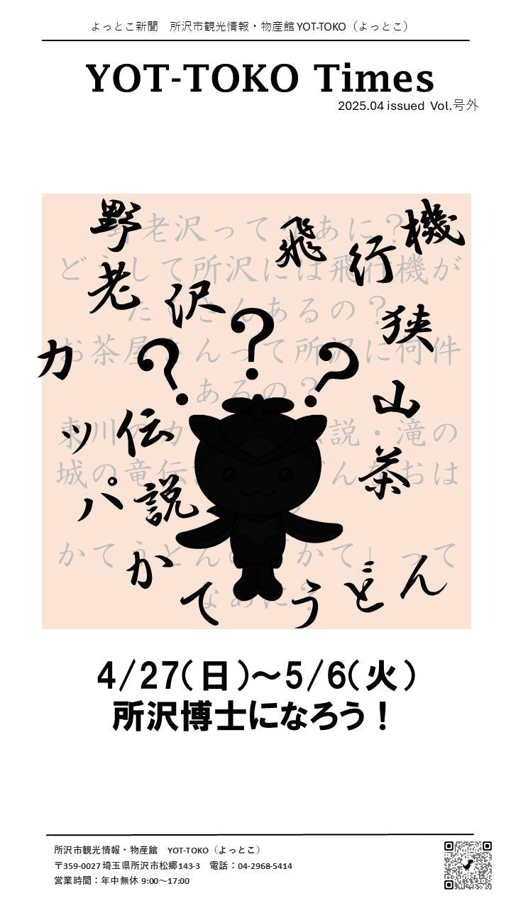 所沢市観光情報・物産館ではGWの4/27(日)~5/6(火)に所沢について知る・発信するイベント「所沢博士になろう!!」を開催いたします。